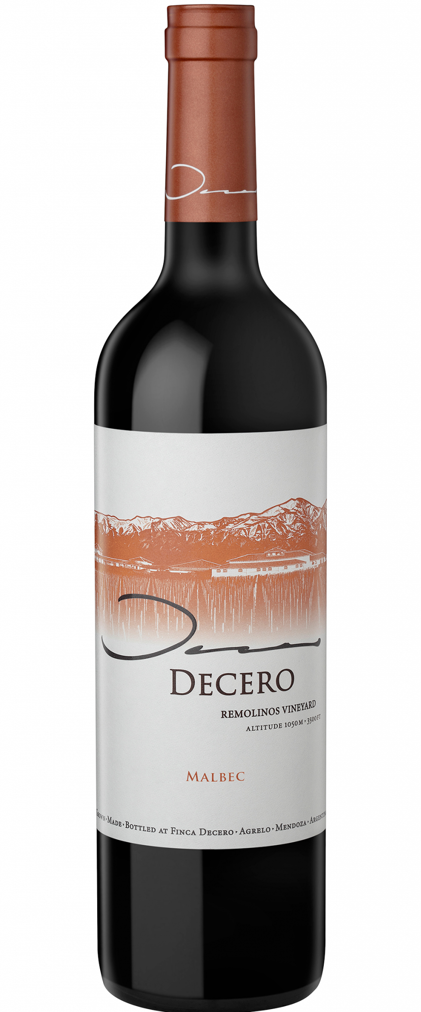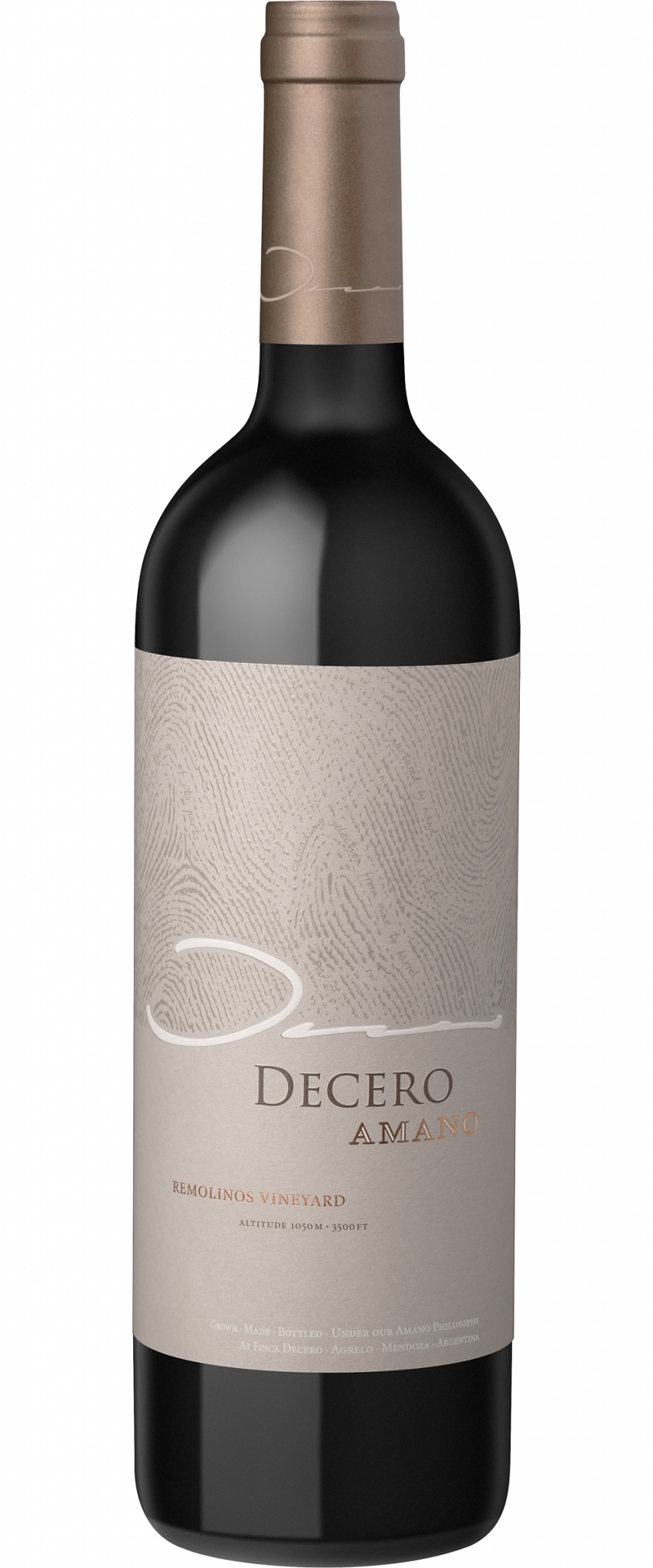Decero Amano takes its name from the “Amano” or “by hand” approach. As the pinnacle of the winery's achievements each vintage, Decero Amano is a blend of the most distinctive parcels from the Remolinos Vineyard. The wine is a blend of Malbec, Cabernet Sauvignon, Petit Verdot and Tannat: violet aromas emanate from the Malbec, red fruit flavors and structure of the Cabernet gives excellent length, while the jasmine perfumed Petit Verdot brings firm tannins as does the Tannat, which adds even more textural complexity.