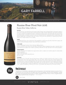 The Russian River Selection bottlings are quintessential Russian River Valley wines blended from some of the region’s top vineyards, taking advantage of varied climates and unique site characteristics.  Undoubtedly showcasing a beautiful expression of the varietal and of the appellation’s unique terroir, this Pinot Noir blend captures the richness, purity and elegance that are Gary Farrell Winery’s trademarks.