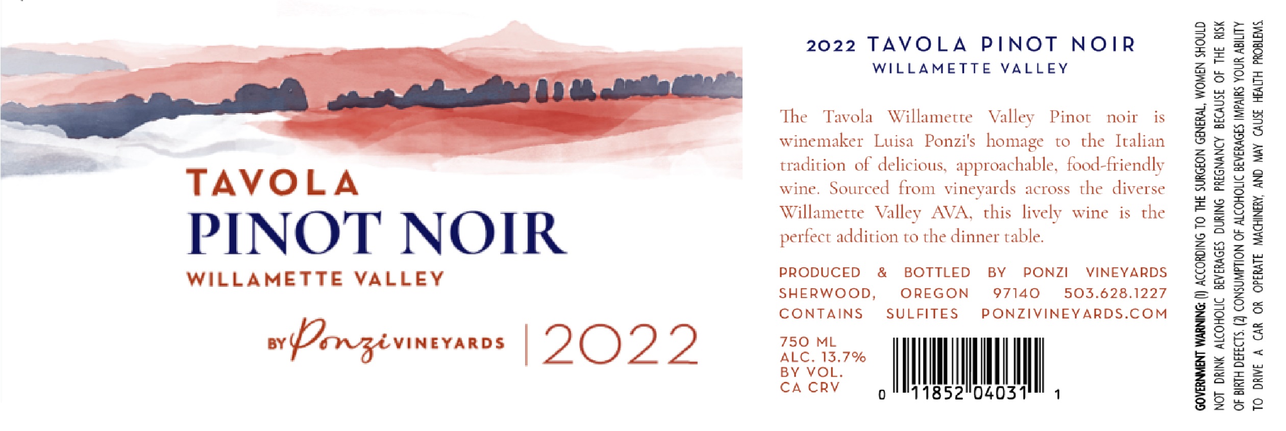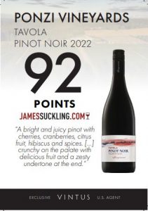 The 2022 Ponzi Tavola Pinot Noir is produced from LIVE Certified Sustainable Ponzi Aurora and Avellana Vineyards, as well as sustainably grown vineyards in the Chehalem Mtns, Yamhill-Carlton and Eola Hills AVAs.